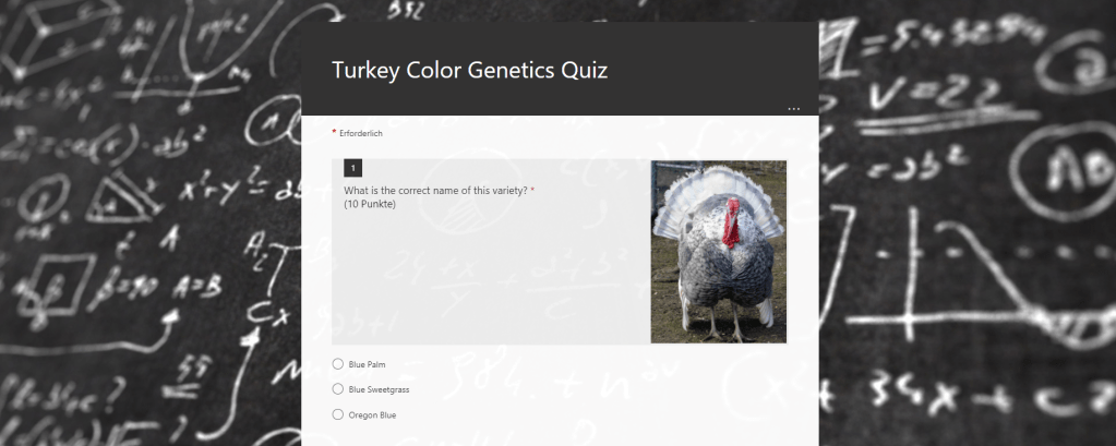 TURKEY QUIZ You want to test your turkey color genetics knowledge? Check out our small quiz. PLAY Teilen mit: Click to share on X (Opens in new window) X Click to share on Facebook (Opens in new window) Facebook Like Loading...